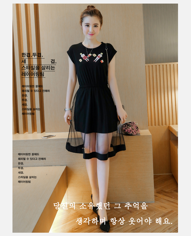 ชุดเดรสแฟชั่นคอกลม สีดำสกรีนลายตามแบบ แขนเต่อดีเทลเก๋ต่อผ้าตาข่ายนุ่มคลุมกระโปรงชั้นนอก ใส่เที่ยว สวยหวาน น่ารักสไตล์เกาหลี