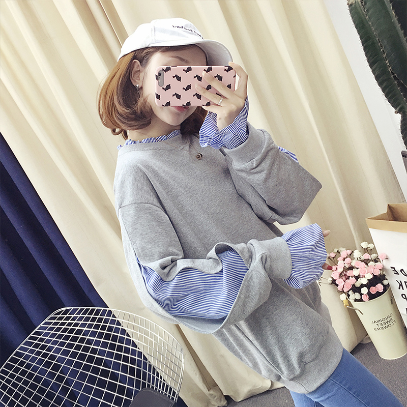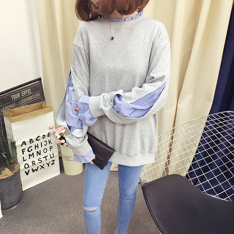 เสื้อแฟชั่นคอกลมสีเทา แขนยาวพองเล็กน้อย ดีไซน์เก่แต่งคอโชว์ชายผ้า