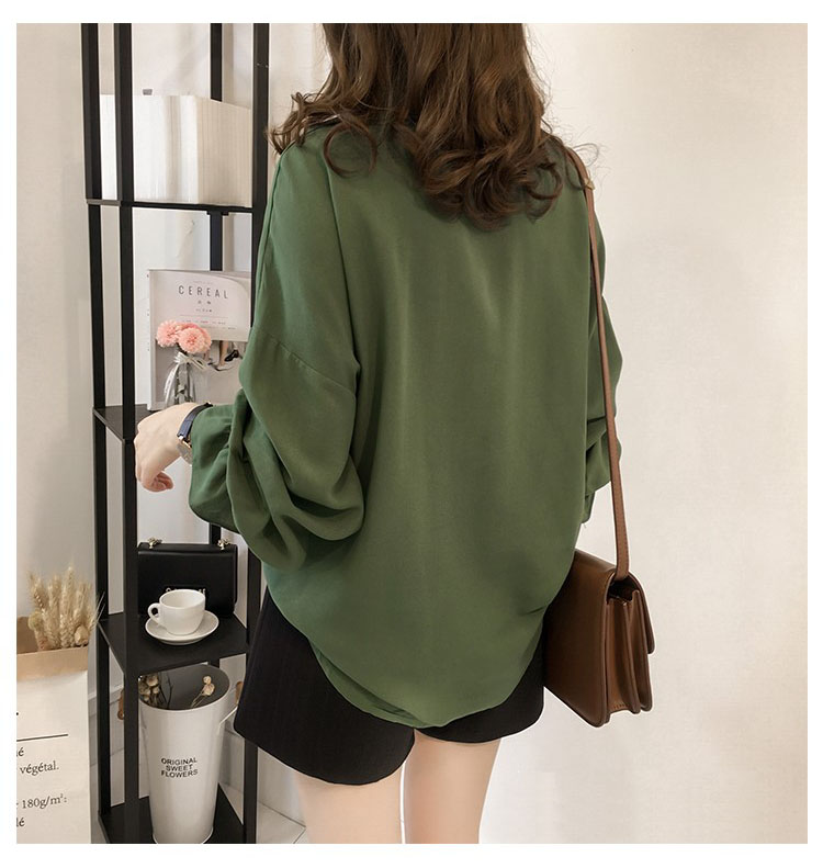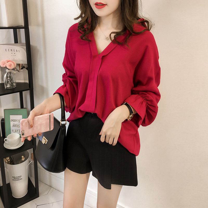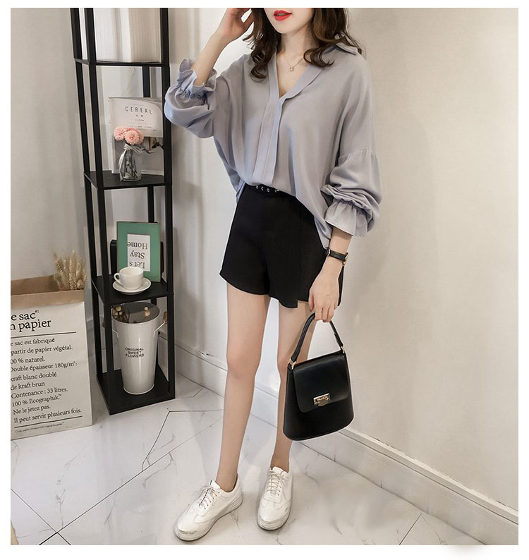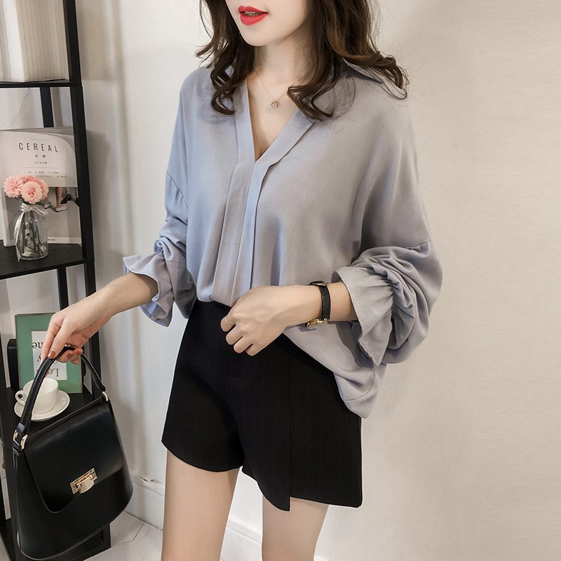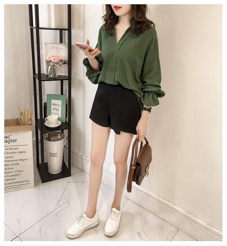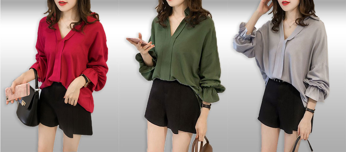 เสื้อคอปกแฟชั่นแต่งคอวีปลายแขนจั๊มพ์ยางยืด