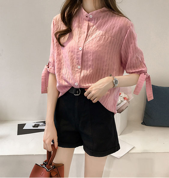 เสื้อเชิ๊ตแฟชั่นคอปิดแขนสั้นเนื้อผ้าแต่งลายตรงปลายแขนต่อสายไว้ผูกโบว์น่ารักกระดุมหน้า 6เม็ด ใส่คู่กางเกงขาสั้นได้ลุคคุณหนูสวยหวานน่ารักมั่กๆ