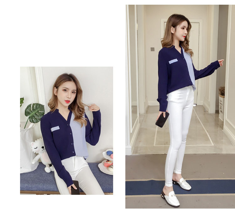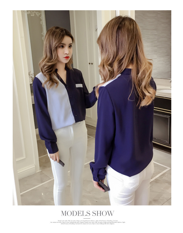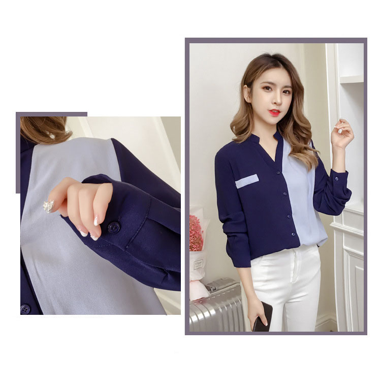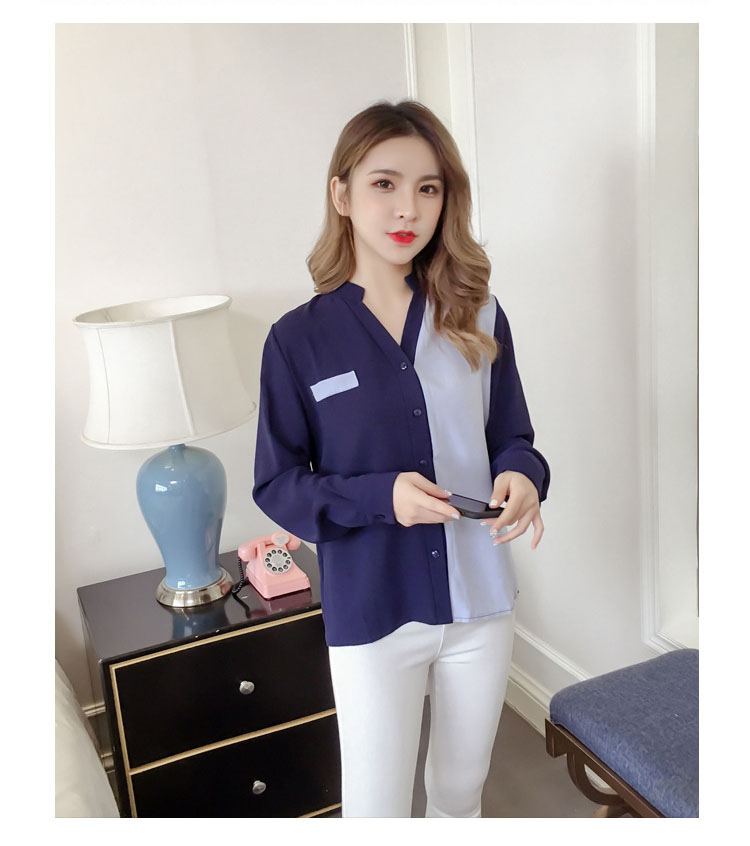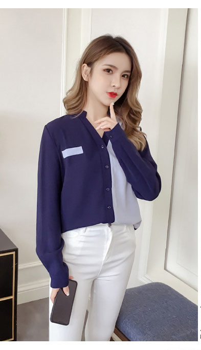 เสื้อเชิ๊ตแฟชั่นสีน้ำเงินเข้มแขนยาว งานสวยมีดีไซน์แต่งสีฟ้าอ่อนข้างซ้าย เสื้อเช๊ตแต่งกระดุมหน้าผ้าใส่สบายๆ ใส่ทำงานสวยๆ ใส่ไปงานก็ได้จ้า