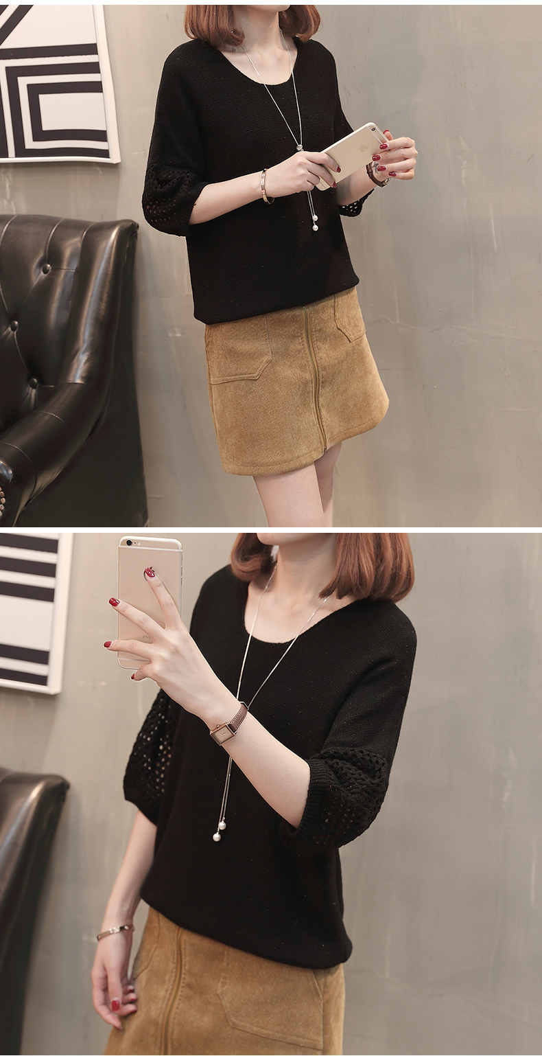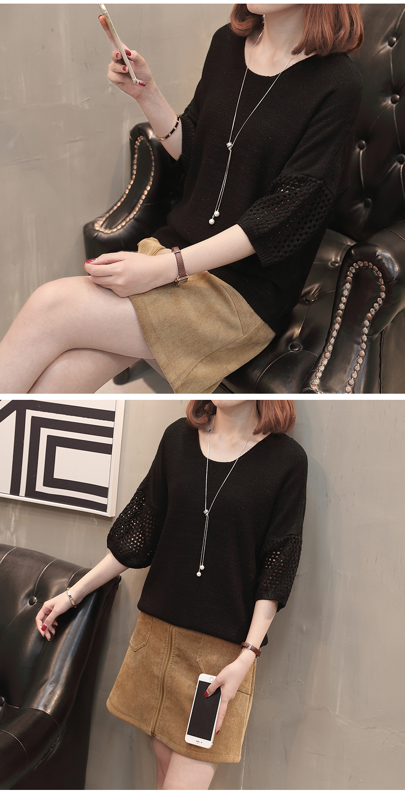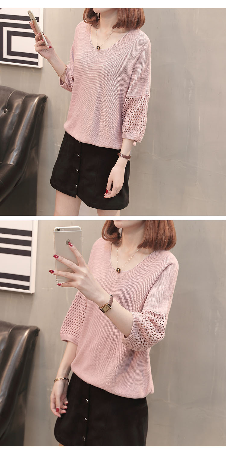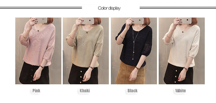 เสื้อแฟชั่นไหมพรมคอกลมแขนสามส่วน เสื้อแต่งฉลุที่แขนและคอเสื้อด้านหลัง ใส่คู่ยีนส์ขาสั้น ขายาว เดฟ สวยหวานสไตล์เกาหลี