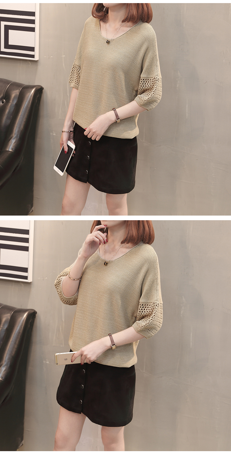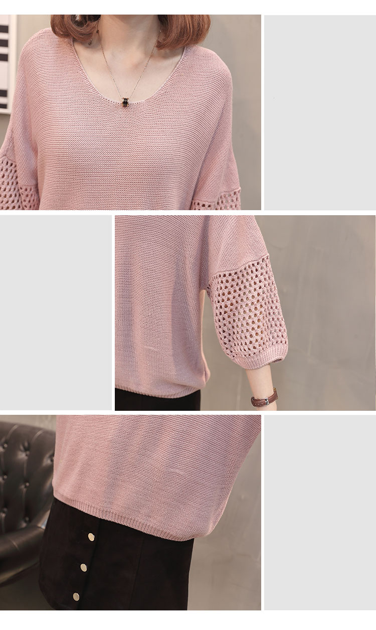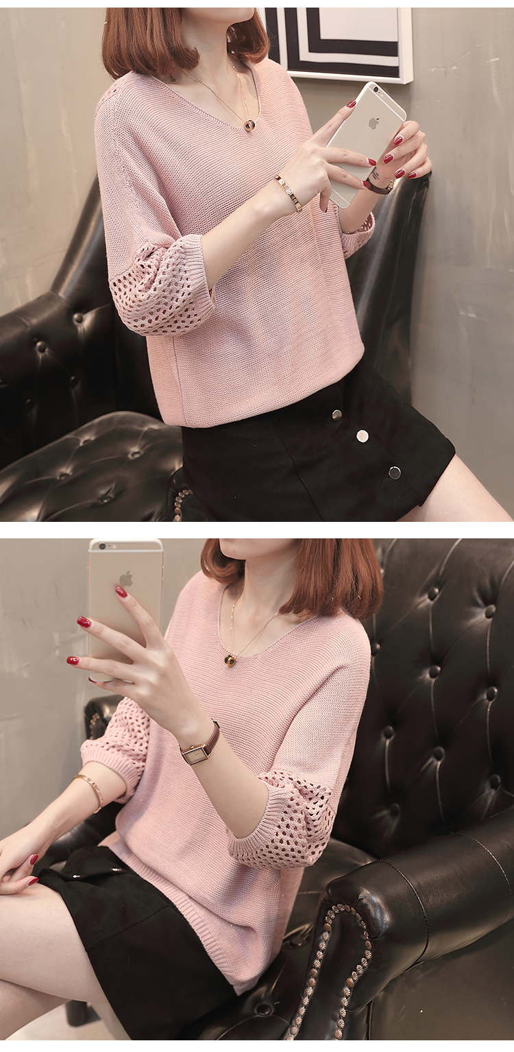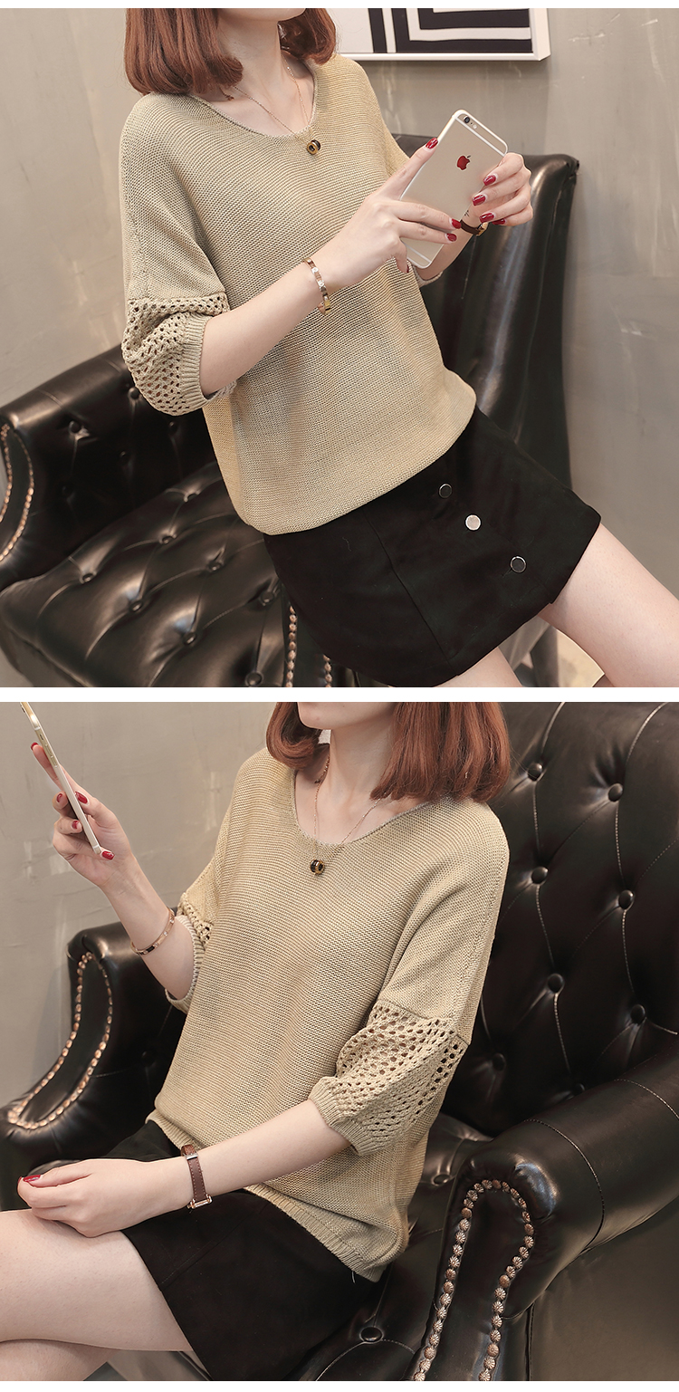 เสื้อแฟชั่นไหมพรมคอกลมแขนสามส่วน เสื้อแต่งฉลุที่แขนและคอเสื้อด้านหลัง ใส่คู่ยีนส์ขาสั้น ขายาว เดฟ สวยหวานสไตล์เกาหลี