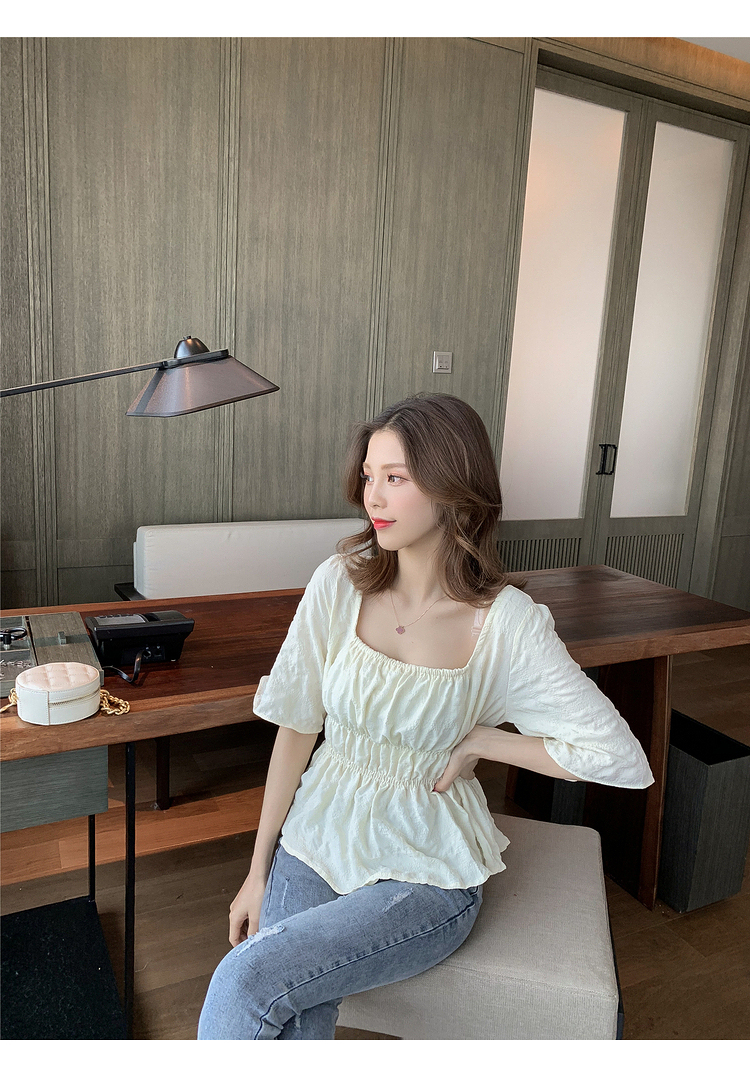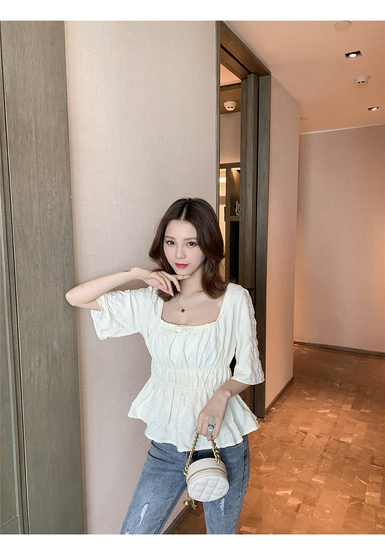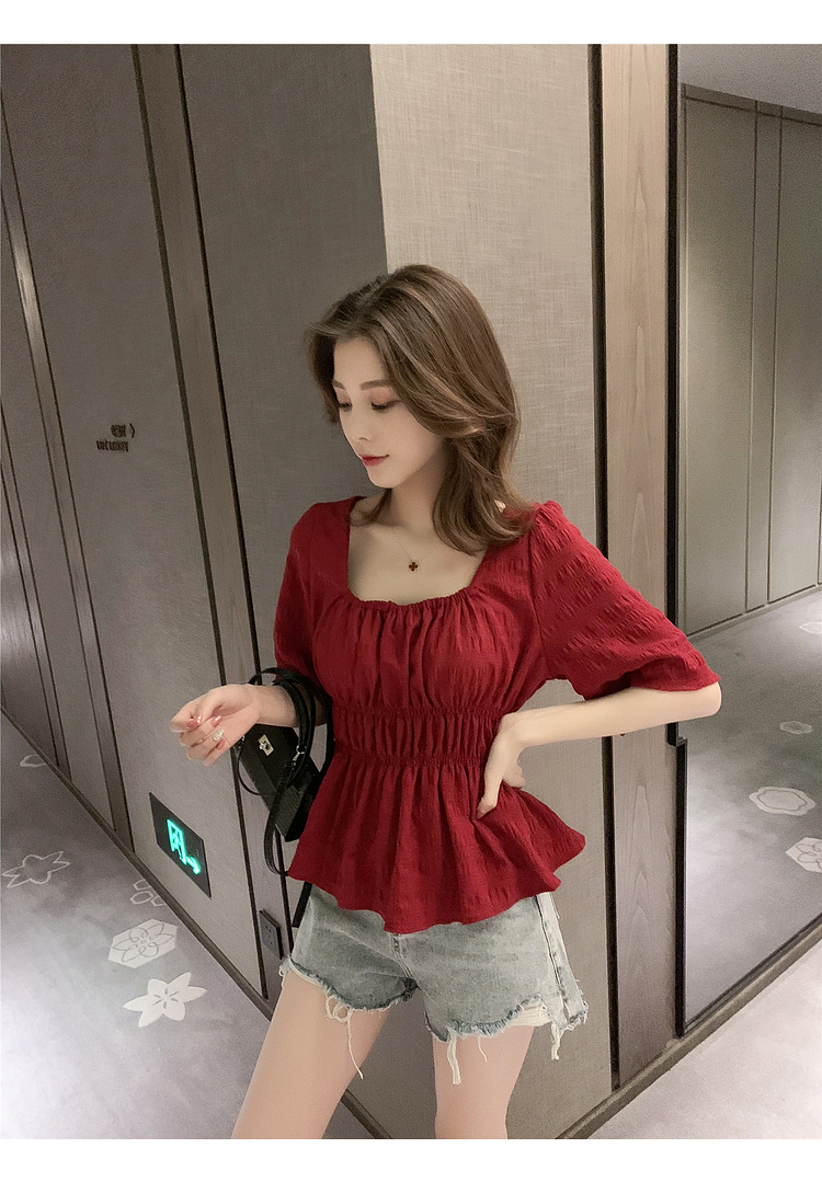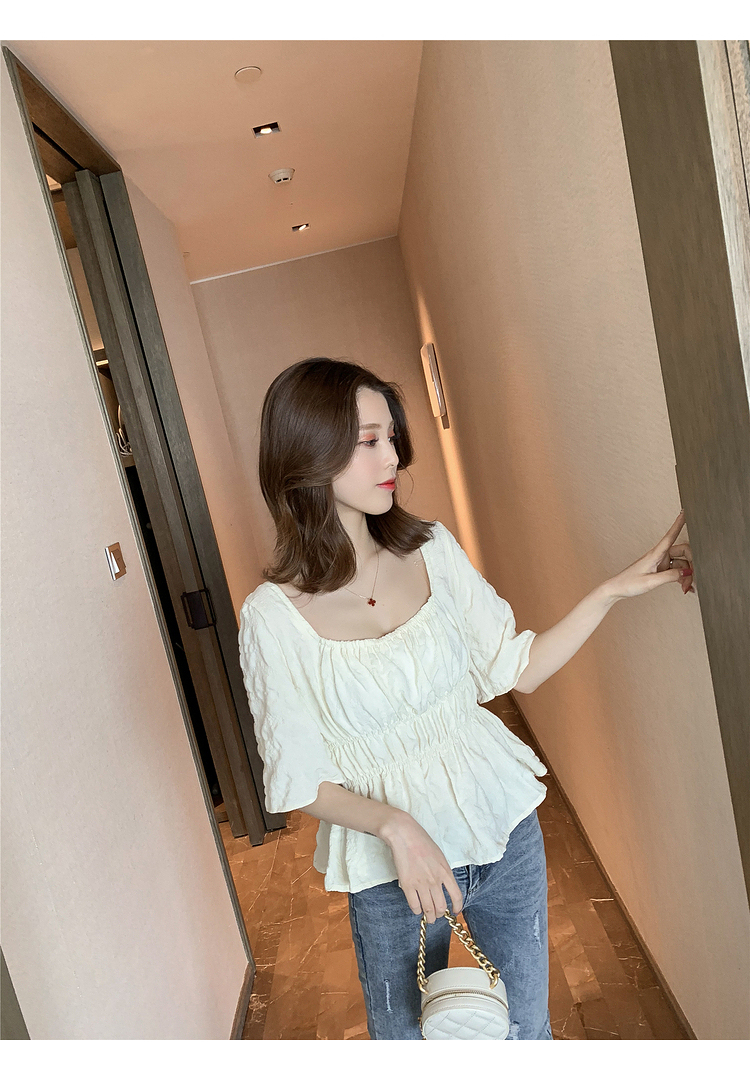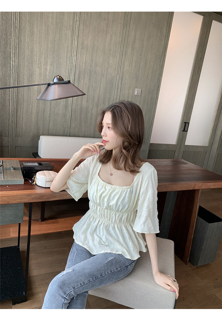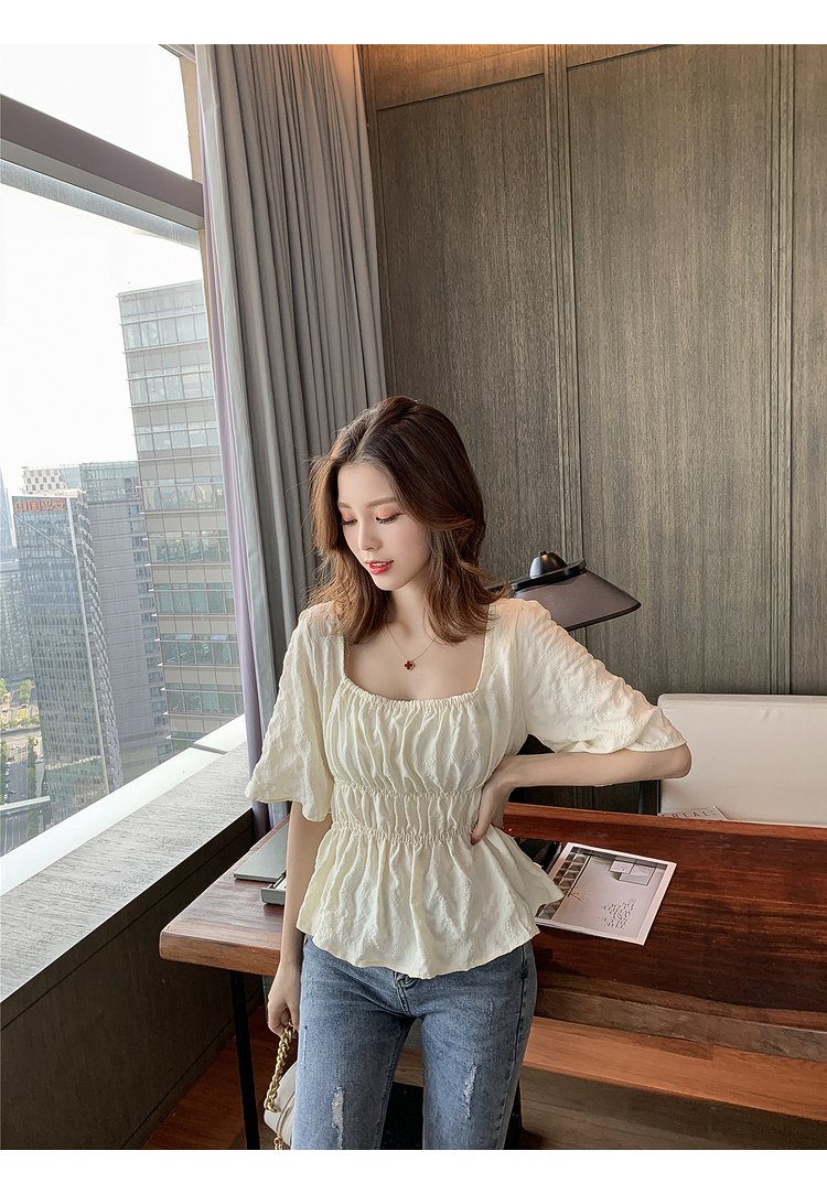 เสื้อแฟชั่นคอเหลี่ยมแขนสั้น สม็อคเอวชายระบาย เนื้อผ้ามีเท็กซเจอปุ่มๆผ้าเบาพริ้วใส่สบาย เสื้อแฟชั่นใส่เที่ยวแบบสวยหวานสไตล์เกาหลี