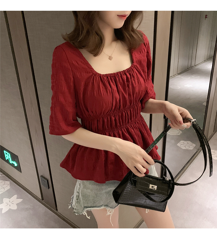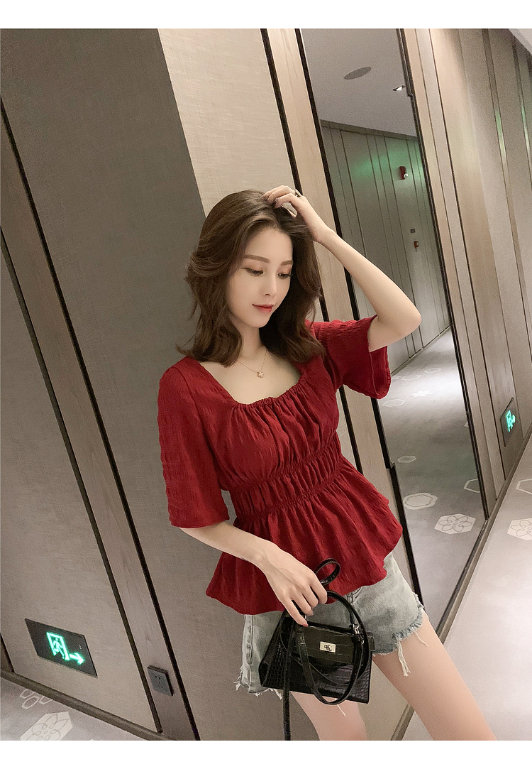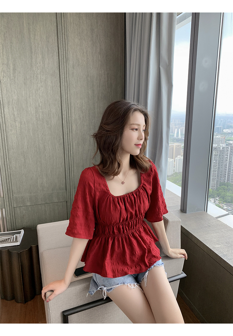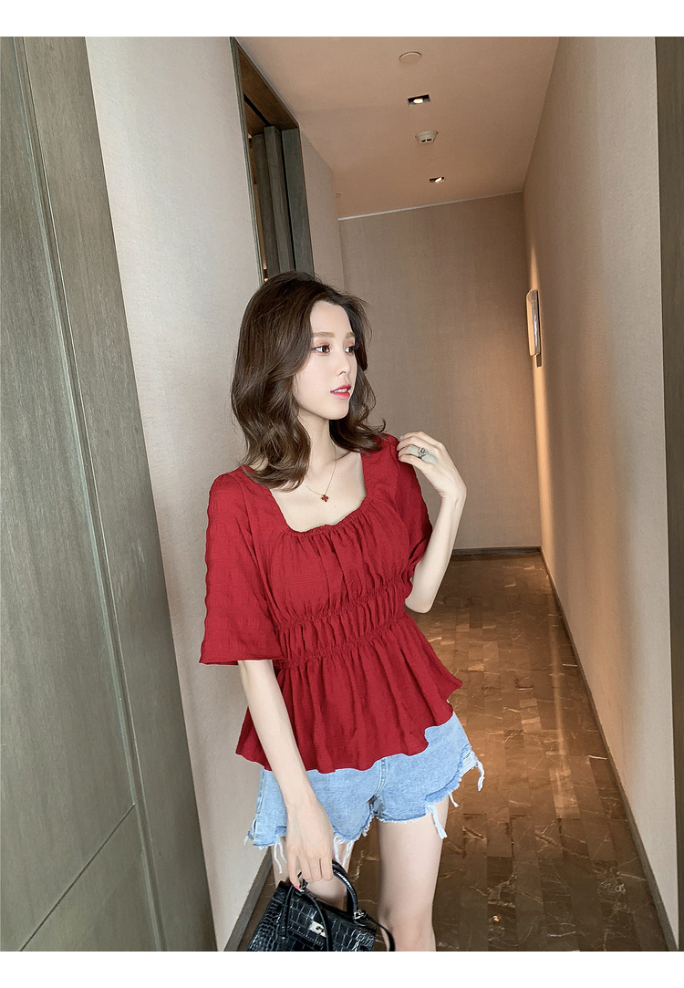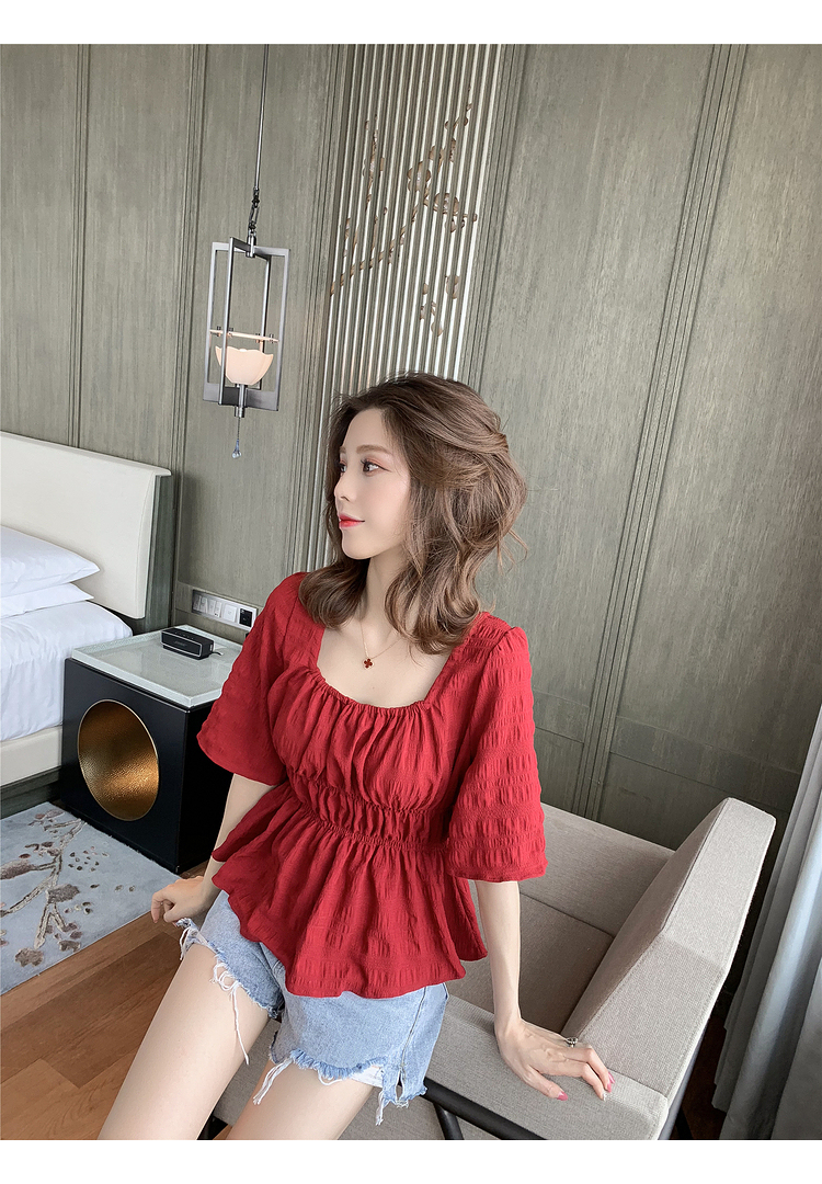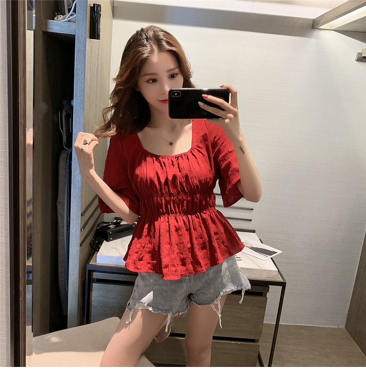 เสื้อแฟชั่นคอเหลี่ยมแขนสั้น สม็อคเอวชายระบาย เนื้อผ้ามีเท็กซเจอปุ่มๆผ้าเบาพริ้วใส่สบาย เสื้อแฟชั่นใส่เที่ยวแบบสวยหวานสไตล์เกาหลี
