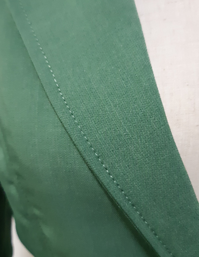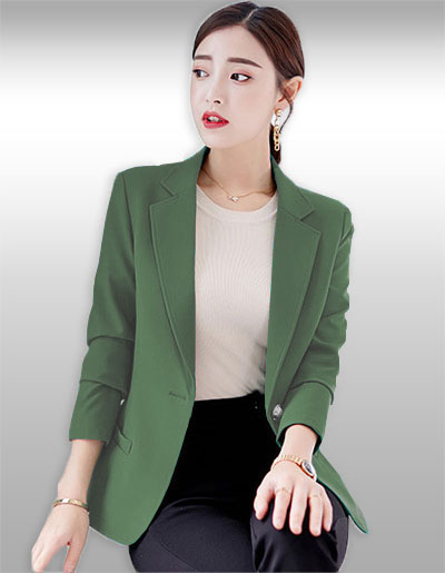 เสื้อสูทผู้หญิงสีเขียวใส่ทำงานสไตล์เรียบหรูสูทตีเกล็ดเข้ารูปหน้าหลังเสริมบ่ามีซับใน กระดุมหน้าและปลายแขนแต่งกระดุมมุก กระเป๋าหน้าสองข้าง มี 5 ไซส